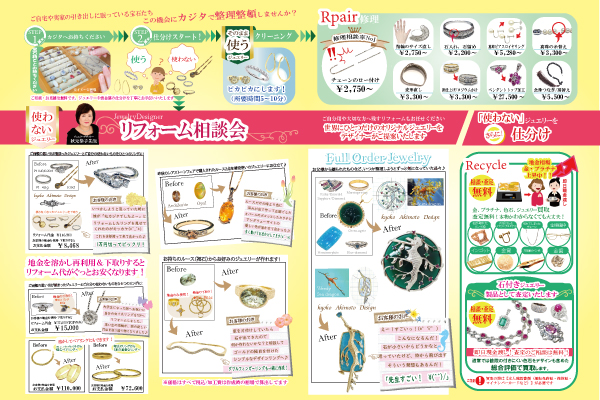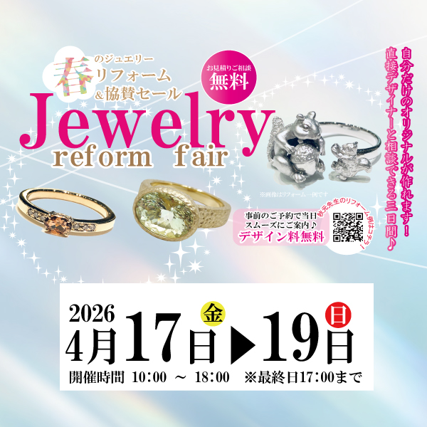 ジュエリーリフォームは出番を失ったジュエリーを、大切な思い出はそのままに、新たなカタチへと作り変えることができます。この3日間はジュエリーデザイナー・秋元恭子先生をお呼びして、宝石リフォーム&オーダーフェアを開催致します。