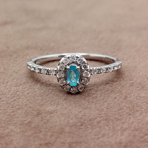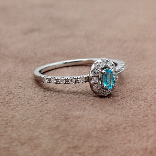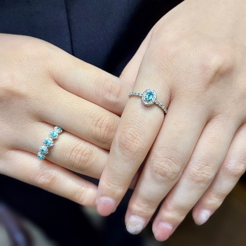 繊細なダイヤモンドの煌めきがパライバの色を引き立て、指先に上品な存在感を与えます。