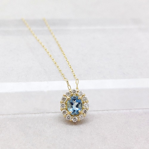 透明感あふれるオーバルカットのアクアマリンをダイヤモンドで取り巻き、上品な華やかさを添えています。