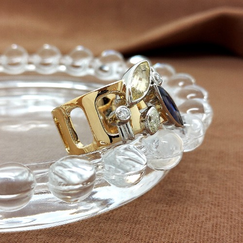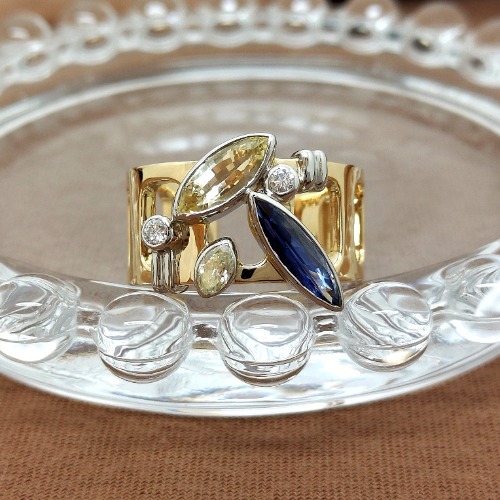 深みのあるブルーサファイアと透明感のあるイエローサファイアを立体的に組み合わせた、アートのようなデザインリング。