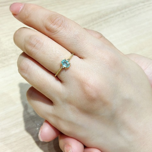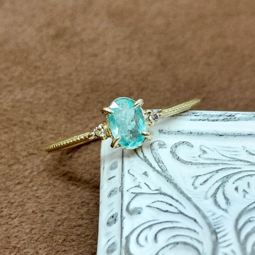 淡く澄んだブルーグリーンが、指先に瑞々しい光を宿すパライバトルマリンのリング。
