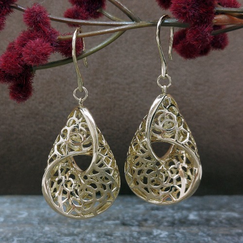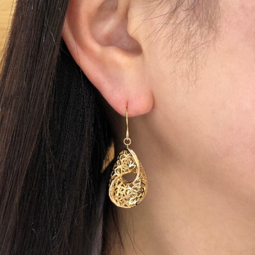 立体的なフォルムがどの角度から見ても美しい、しずく型の透かし模様ピアス。