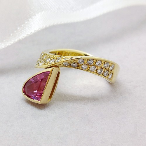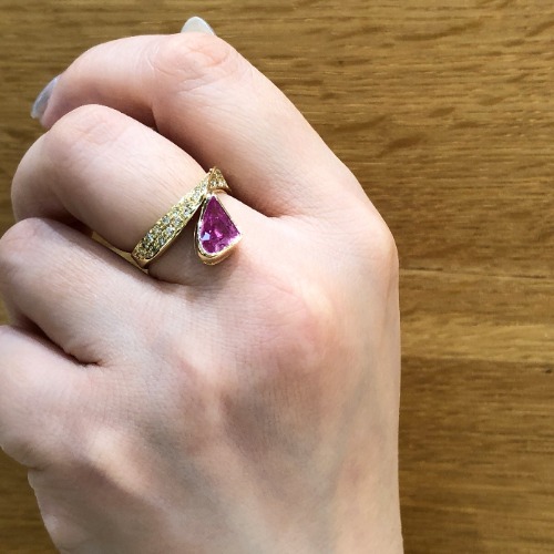 しなやかなフォルムが指元に自然な動きを生み、そのラインに沿ってダイヤモンドがきらめきます。ピンクサファイアが鮮やかなアクセントに✨