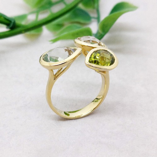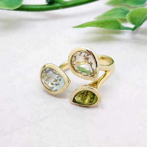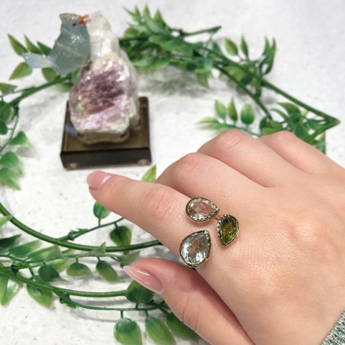 ペリドットの鮮やかなグリーンに、透明感溢れるトパーズ、淡く透き通るブルートパーズが寄り添い軽やかな立体感を生み出します。