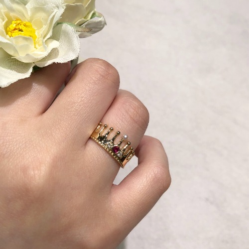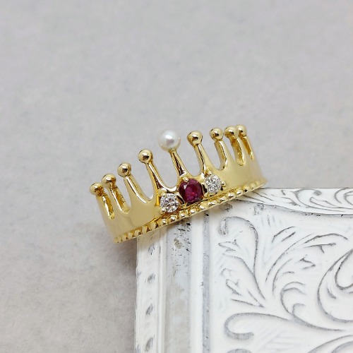 深紅のルビーにダイヤモンドの光とパールの柔らかさを重ねた王冠モチーフのリング👑