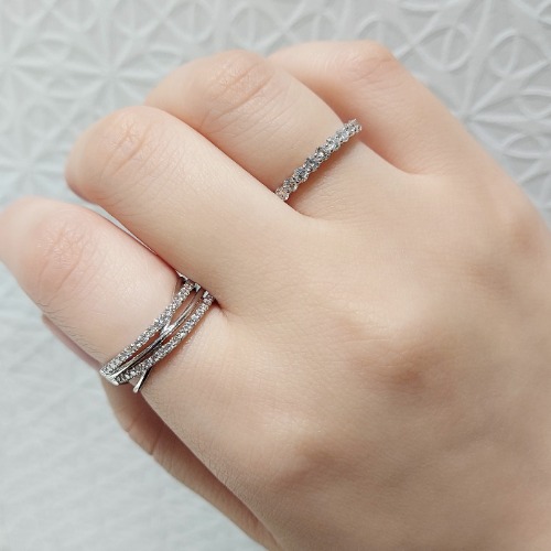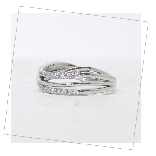 ダイヤモンドと艶やかなプラチナのラインが立体的に交差するリング。
