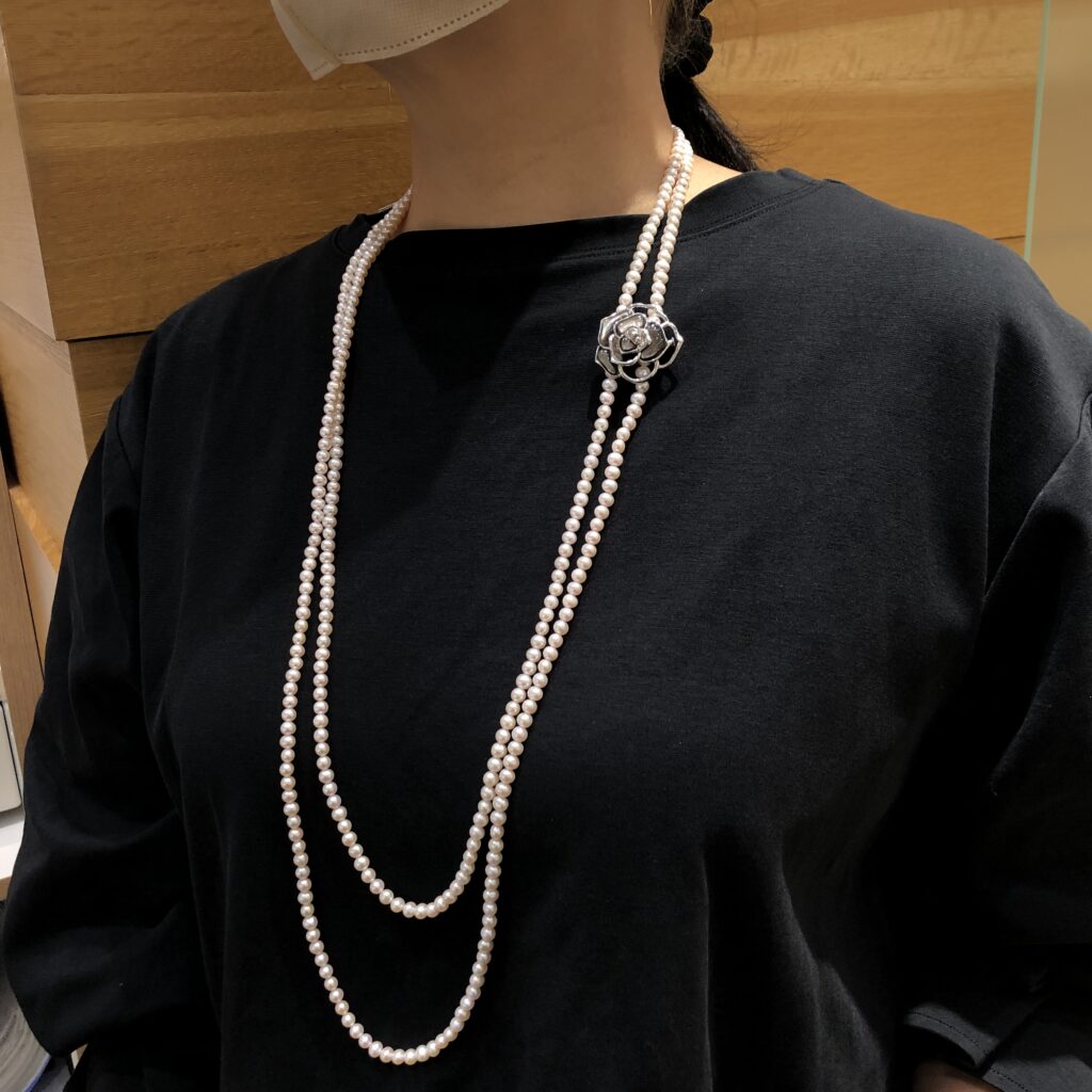 留め具位置、二重使い、重ね着けなどを組み合わせると、一連パールだけでも10通り以上の表情を楽しむことができます。