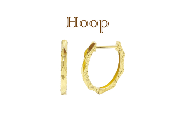 せっかく頑張って稼いだお給料をつぎ込むなら、しっかり毎日着けたい!このゴールドのフープピアスは正面は切子細工のようなカッティングで光を反射、サイドは和紙のような光を落ち着かせるカットを施してます。華奢なフォルムでも、まるでダイアモンドが留めてあるのかと思わせるほどキラキラ光り、存在感抜群です!