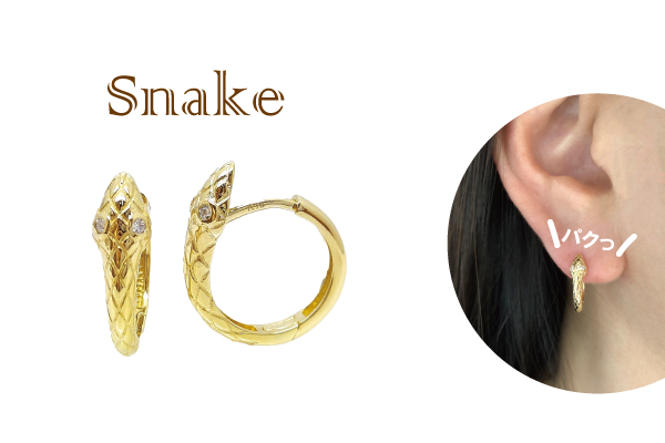 耳たぶにパクっとかみついたようなユニークなヘビのピアス!蛇のピアスというとハードなイメージですが、目には1粒のダイアモンドが輝いており、意外とチャーミングなお顔をしています♪