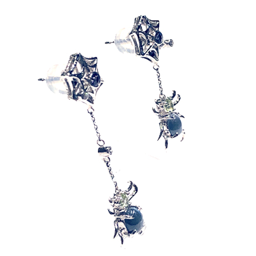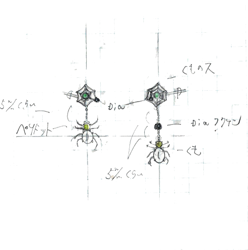 当店のリフォームフェアへご来店いただきました。今回のオーダーは、数年前から構想されていた念願の蜘蛛モチーフをご希望されました。初めは「ブレスレットにしてキャラっぽい蜘蛛かな~」とご相談いただいたのですが、和装でお出かけされることが多いので、お着物にも合うクールかつリアルな蜘蛛にして、動きのある左右非対称のデザインをご提案いたしました。アレキサンドライトキャッツアイのルースとアレキサンドライト&ペリドットのピアスが1つの作品としてよみがえり、ちょうどHalloweenの日に到着♪お渡しの際も「おぉ~(^^♪」と出来上がりも大変お喜びいただき、「着けて帰ります(#^.^#)♪」というお姿も素敵でした!またぜひ、お着物姿と共に着けられたところも拝見したいです♡