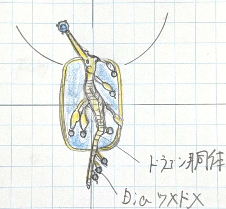 当店のレアストーンフェアでご購入いただいたミルキーブルーが美しい「ヘミモルファイト」に、①で残ったメレダイアモンドとプラチナブルーダイアモンドリングを組み合わせて、こちらもご自身の干支にちなんだ「リーフィーシードラゴン」をご希望されました。②に関しては、「デザインは秋元先生にお任せ♡どんなのになるか楽しみ(^^♪」と出来上がりを心待ちにされておりました。お渡しの際は、「えーーーすごい!こんなになるんだ(#^^#)ヘミモルファイトが小さめだからドラゴンが小さくなって分かりにくいかと心配していたけど枠から飛び出す発想、先生すごい!(*'▽')」と大変喜んでいただけました♪