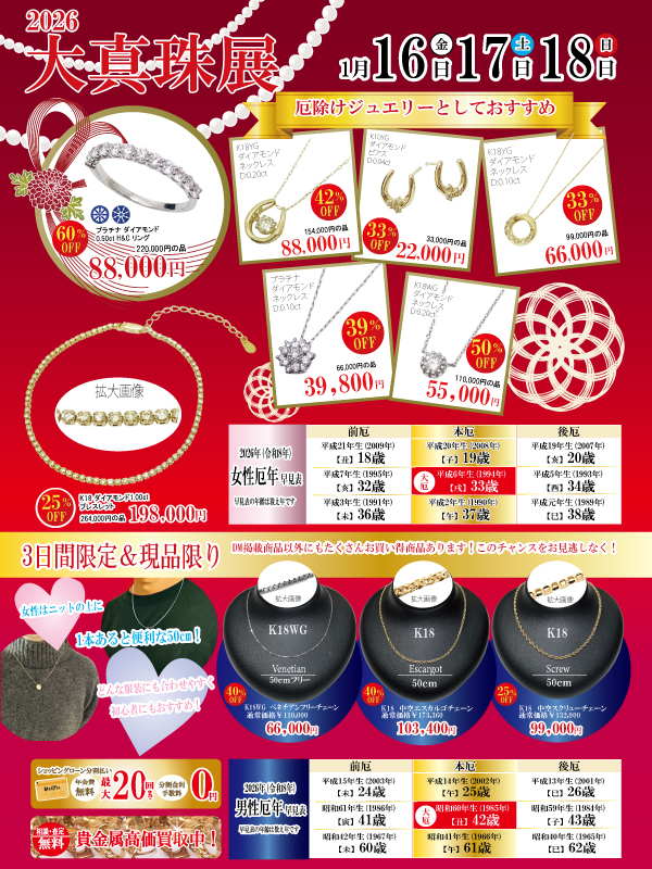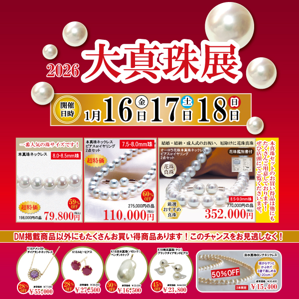カジタでは、1月16日~19日の3日間、厄除けジュエリーに最適な七色に輝くものとして、真珠のネックレスやアミュレット(虹の配色の7石を使用したもの)など、期間限定・特別価格にて大奉仕いたします。